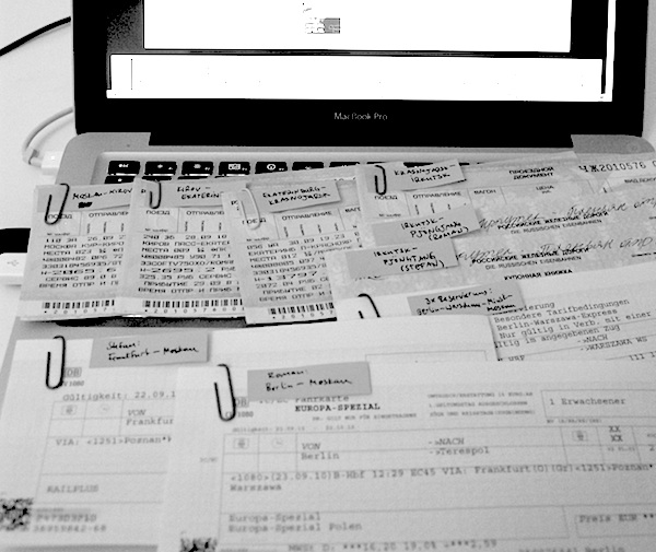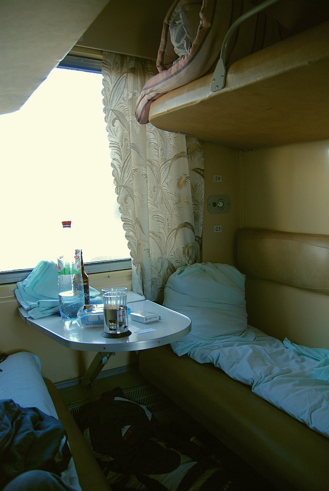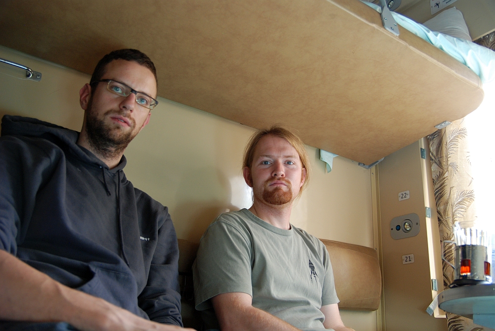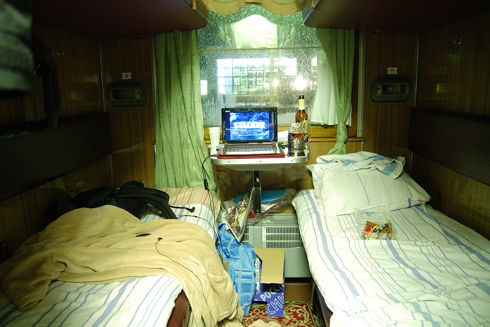 Am Gleis wartet ein alter russischer Zug auf uns. Damals, als ich von Berlin nach Kiew fuhr, war ich schon beeindruckt, aber dieser ist weißrussischen Typs und dementsprechend eingerichtet – Gardinen und Samowar auf dem Gang, Blumentöpfe an den Fenstern und russische Folklore aus dem Lautsprecher. Wir reisen im 4-Mann-Abteil. Unsere Zimmergenossen schweigen viel und gehen früh schlafen. Einer schmuggelt offenbar eine Nähmaschine. Stefan hat das genauer mitbekommen und schreibt dazu selbst was.