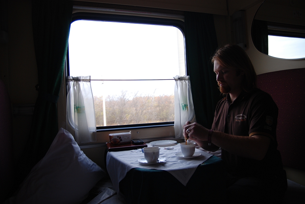 nächsten Morgen dürfen wir ausschlafen, denn wir erreichen unser Ziel erst um 12 Uhr. Alle bisherigen Züge endeten immer gegen 8 Uhr im Zielbahnhof. Die Sonne scheint durchs beschlagene Fenster mitten ins Bett, der Russe