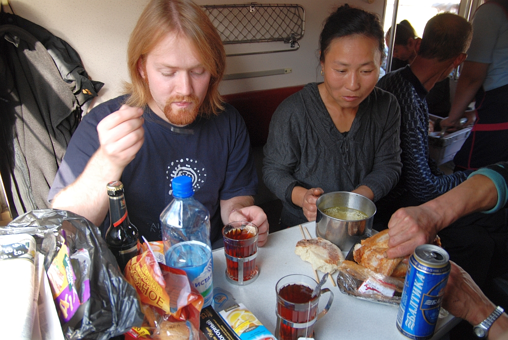 offiziell die transsibirische Eisenbahn. Wir steigen wieder in unser 4-Mann-Abteil, 900 Kilometer liegen vor uns. Der Waggon hat schon bessere Tage erlebt: die Inneneinrichtung ist aus ockerfarbenem Plastik, die Bänke