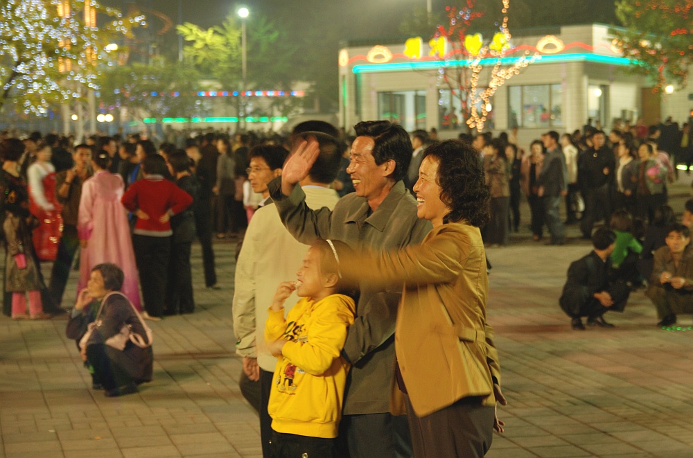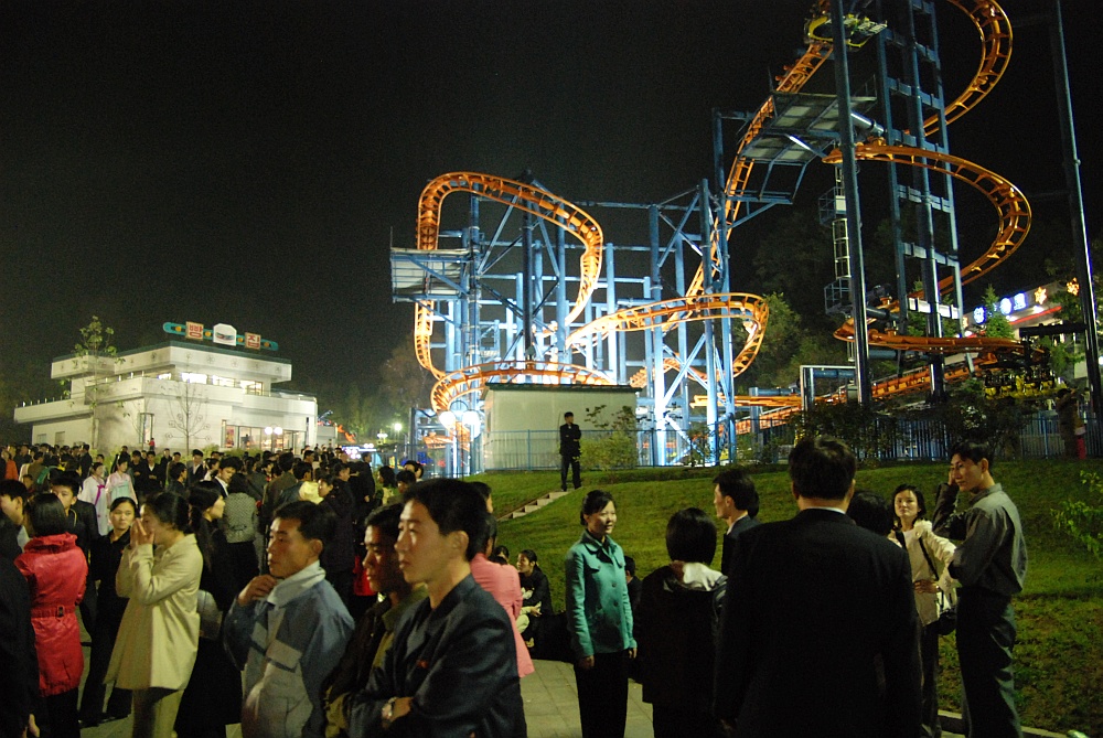 Als wir den Bus verlassen, bewegt sich ein geschlossener Block vergnügungswilliger Bürger Richtung Eingang. Als die Ordner unsere Delegation sehen, wird er wird nach wenigen Metern per Trillerpfeife zurückkommandiert, alle reagieren sofort ohne zu murren. (Die Trillerpfeife dient in Nordkorea generell als Autoritätsorgan, im Straßenverkehr und am Bahnhof, überall, wo Menschen koordiniert werden. ) Der zentrale Zugang wird plötzlich menschenleer, wir laufen hindurch und stehen plötzlich mittendrin – Im Vergnügungspark Pjöngjangs unter tausenden Nordkoreanern. Hier ist nichts grau oder öde – Nordkoreaner, die lachen und Autoscooter fahren und sich in irgendwelchen verrückten Dreh-Schleuder-Karussels und Achterbahnen amüsieren. Wer uns sieht, schaut uns an wie Außerirdische. Kinder können gar nicht mehr wegschauen. Ansonsten fallen wir kaum auf in diesem Getümmel.